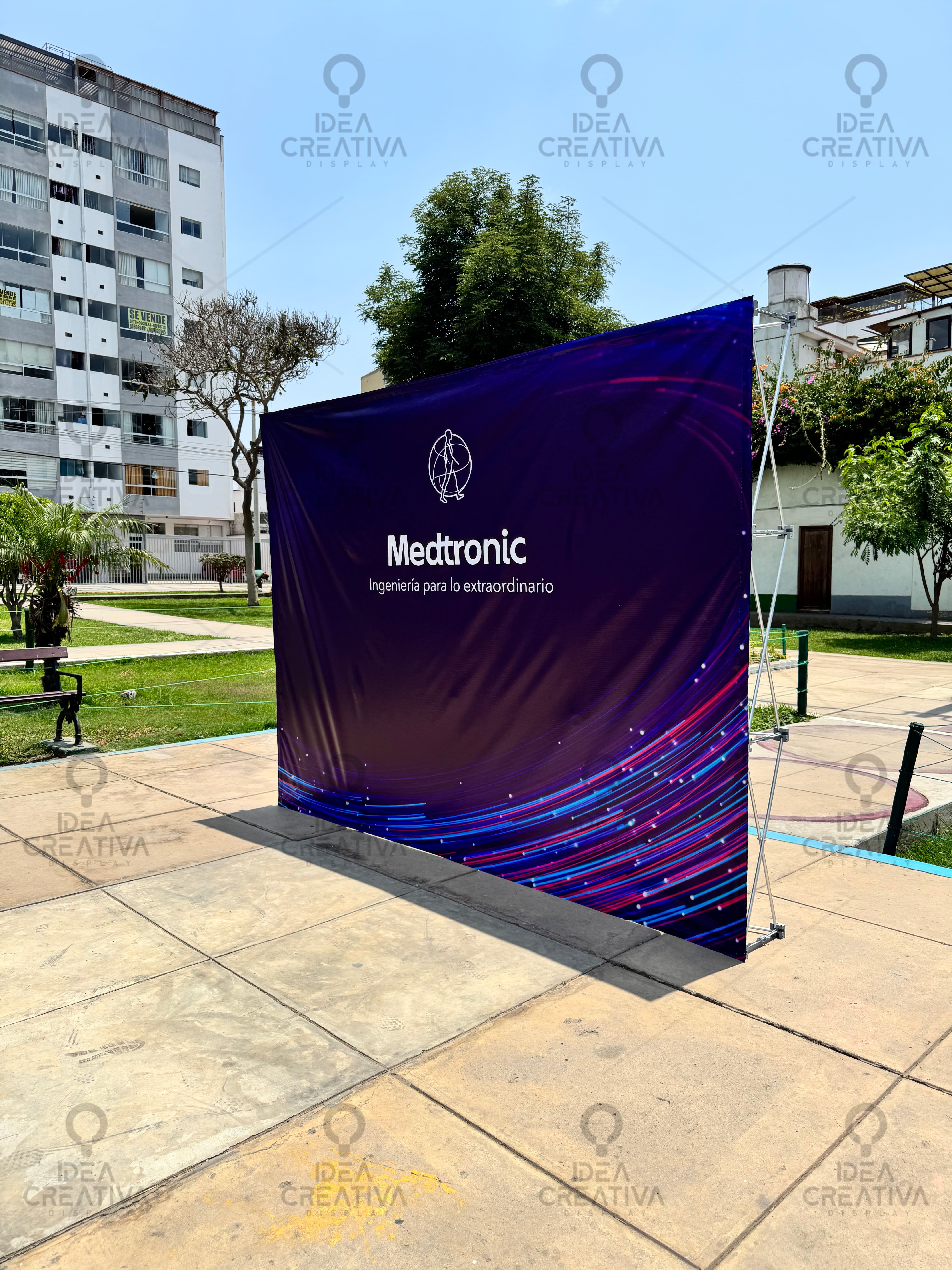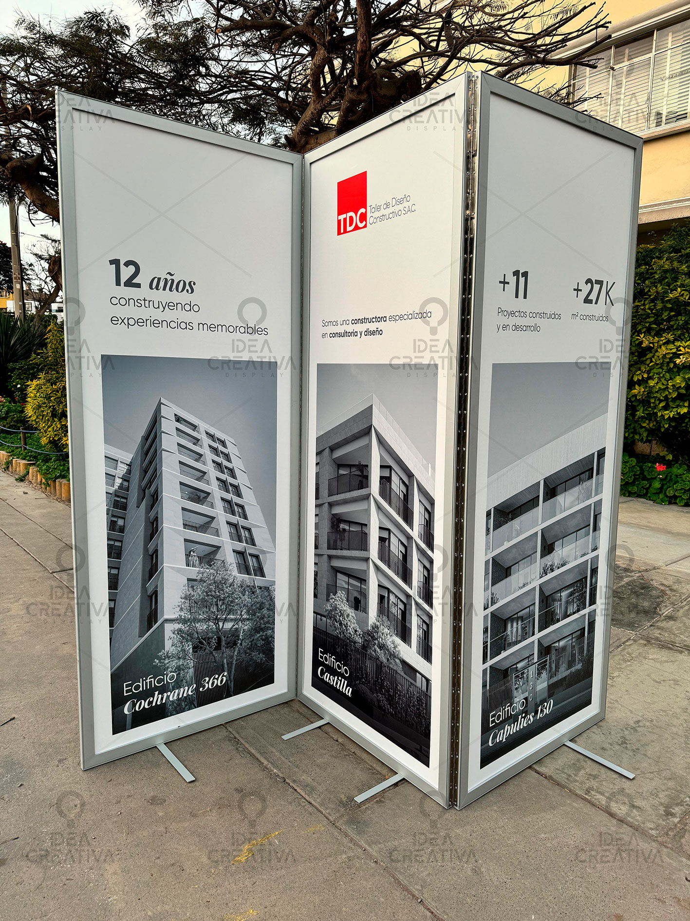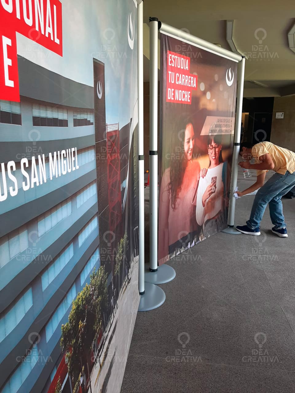 Imagen: La impresión de alta resolución es realizada en banner mesh de finos agujeros para resistir los vientos fuertes dependiendo el lugar donde se instalará, el aspecto sobrio y elegante del metal color gris matte brinda una imagen profesional y de alto impacto.